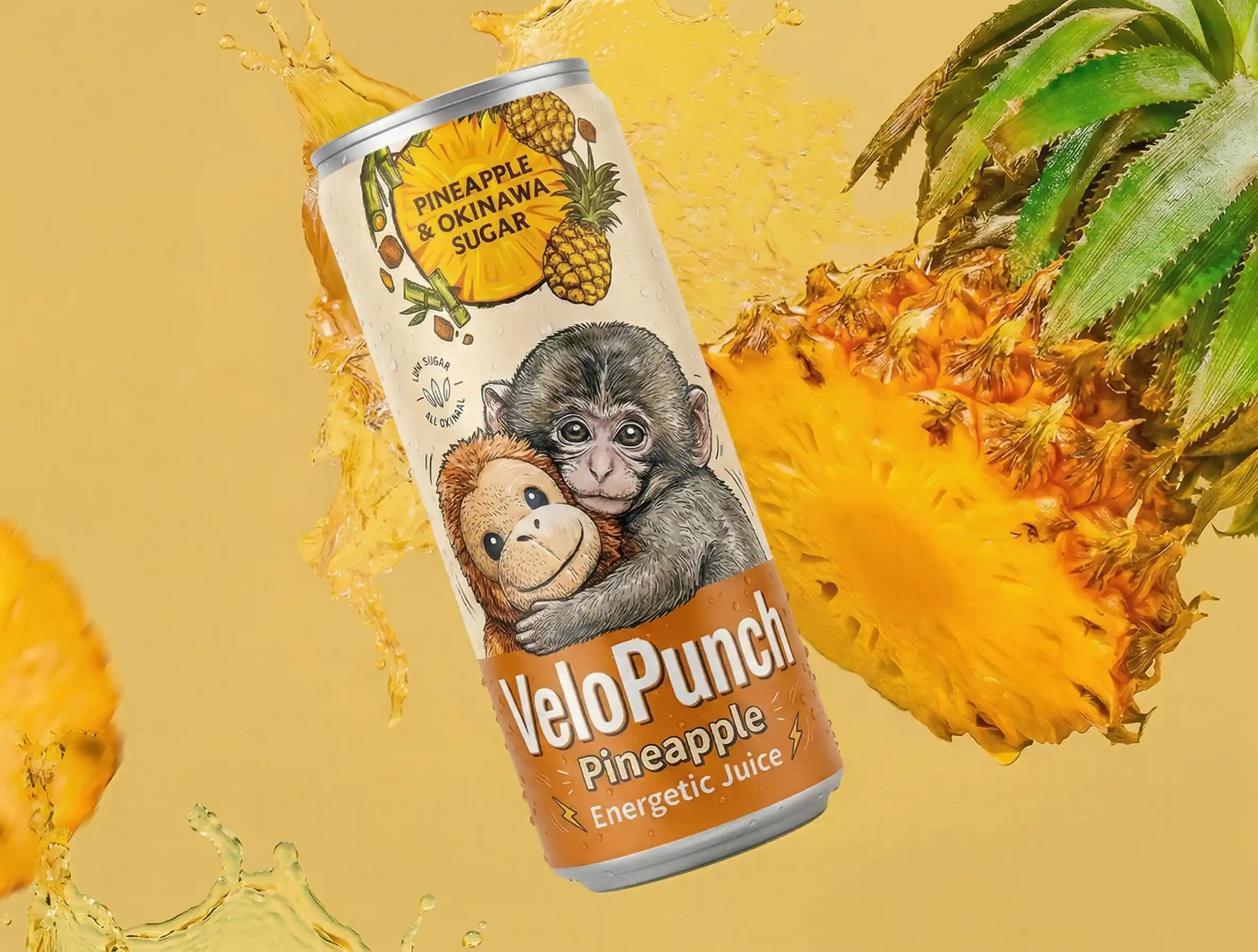 VeloPunch, a fresh energy juice concept crafted by Velocigrafx, packs a serious punch with its unique "punch lonely monkey" theme.